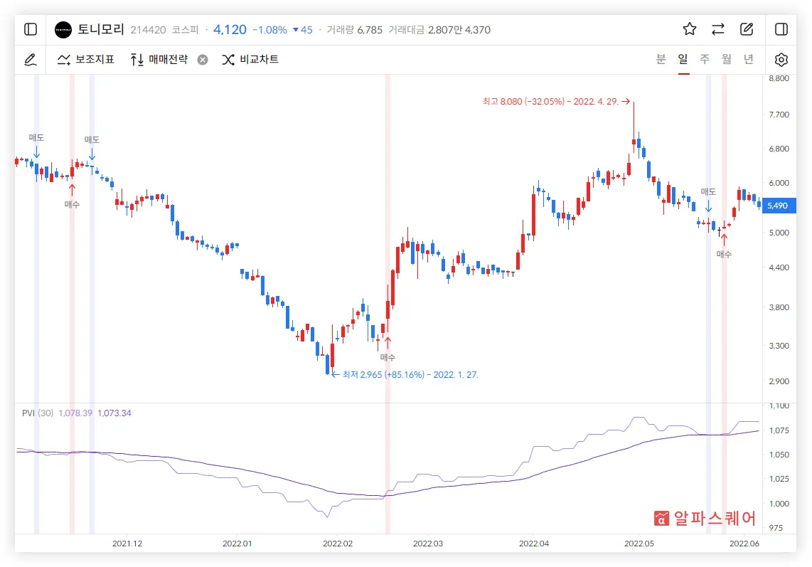 💡 PVI가 Signal을 상향 돌파하면 매수하고 하향 돌파하면 매도하는 전략을 사용할 수 있다.
