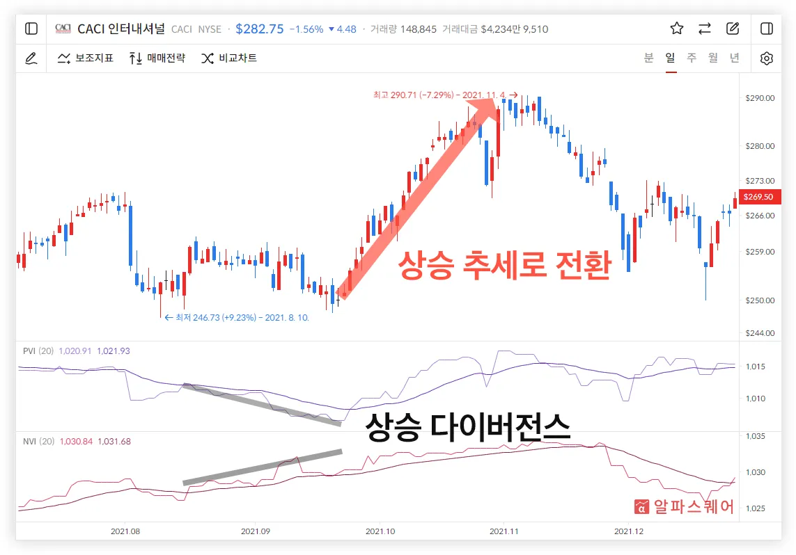 💡 NVI와 PVI가 다이버전스를 이루면 매매하는 전략을 사용할 수 있다.