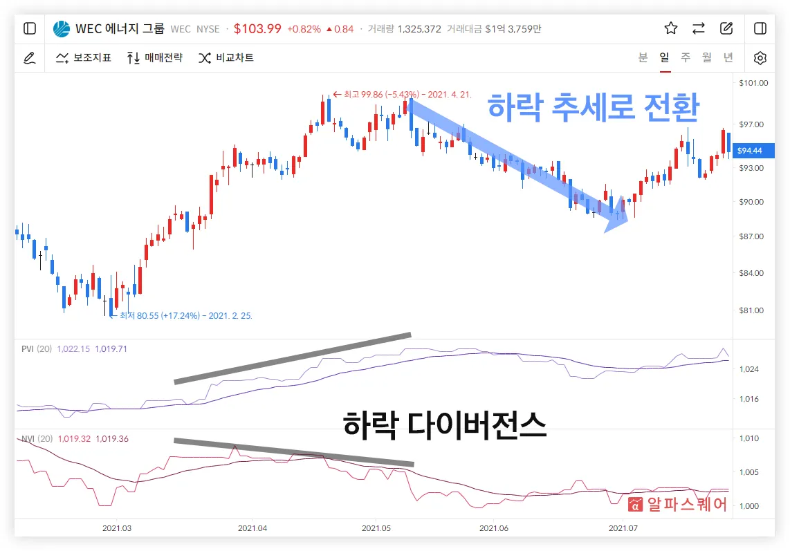 반대로 시장이 과열되어 주가가 점점 오를 때, 일반 투자자는 상승장의 지속을 기대하며 매수하는 반면 전문 투자자는 주가가 실제 가치에 비해 과하게 올랐다고 생각하며 매도를 한다. 즉, 일반 투자자들의 매수 압력이 커지며 PVI는 증가하는 반면 전문 투자자들은 매도를 시작해 NVI는 감소하는 다이버전스가 발생한다면 주가의 하락을 예측하고 매도하는 전략을 사용할 수 있다.