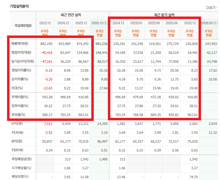 부채비율은 2023년 543%에서 2025년 416%로 감소하고 있으며, 유보율은 2023년 585%에서 2025년 963%로 증가하고 있습니다.