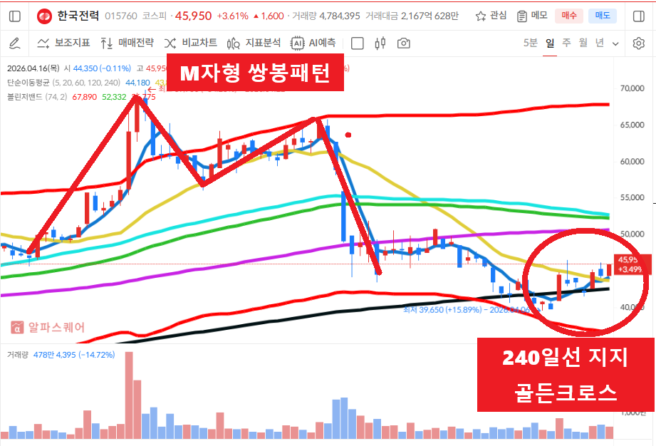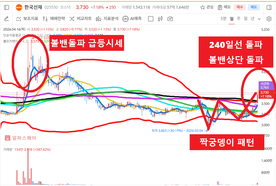 가격조정을 받으면서 하락이후 5일선이 20일선을 골든크로스 이후 횡보하던 주가는 단기 급락하면서 짝궁뎅이 차트패턴을 만들어주고 상승흐름을 보여주던 주가는 240일선과 볼린져밴드 상단선을 돌파하고 있습니다.