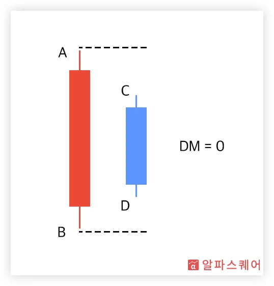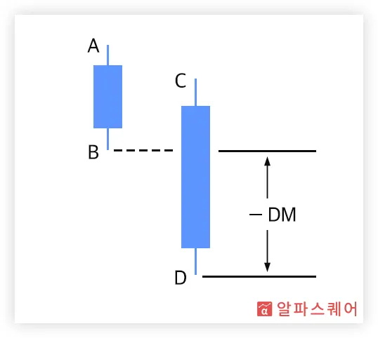 반대로, <그림 2>는 고가와 저가 모두 전날보다 하락하였기 때문에(C<A, D<B) 명확하게 하락하는 모습을 보이고 있다고 할 수 있다. <그림 1>의 경우와는 반대로, 전날 저가(B)와 당일 저가(D)의 거리(B-D)로 하방 움직임의 크기(-DM)를 측정한다.