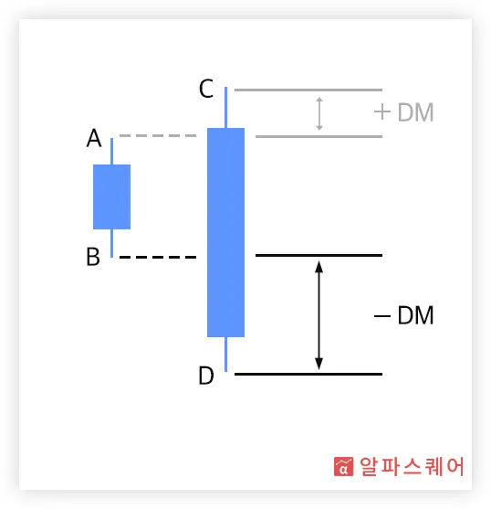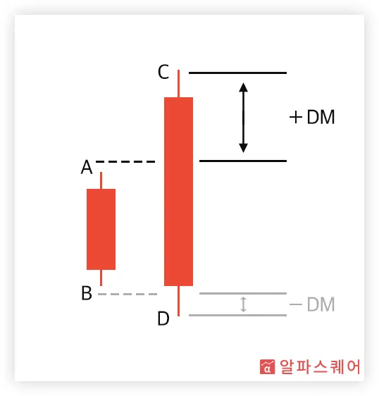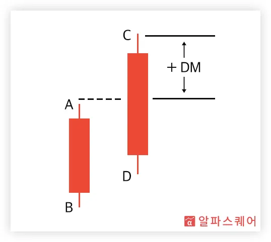 예를 들어, <그림 1>의 경우, 고가와 저가 모두 전날보다 증가했기 때문에(C>A, D>B) 명확하게 상승하는 모습을 보이고 있다고 할 수 있다. 이경우 DM의 계산 시 당일과 전날의 고가만을 고려한다. 이 때, 상방 움직임의 크기는 당일의 고가(C)와 전날의 고가(A)의 거리(C-A)로 측정할 수 있으며, 이를 +DM이라고 부른다.