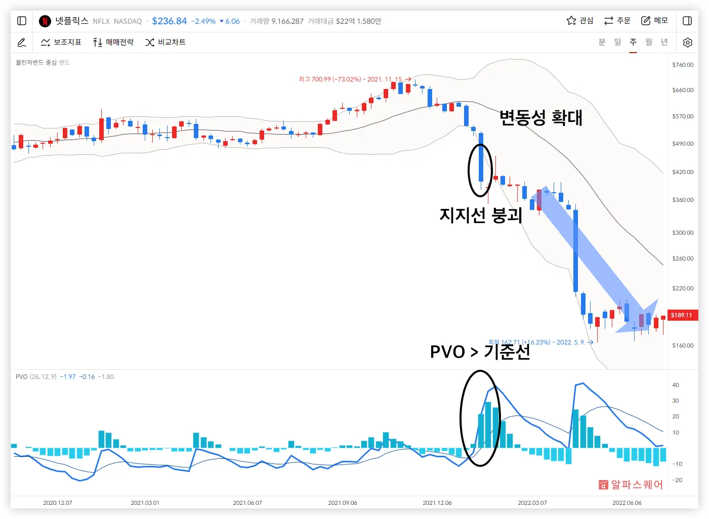 밴드 형태의 변동성 지표를 활용하면 저항선이 상향 돌파되거나 지지선이 하향 돌파되어 붕괴하는 신호를 찾을 수 있다. 이 경우에 PVO를 활용하면 신호의 신뢰성을 높이거나 낮출 수 있다.