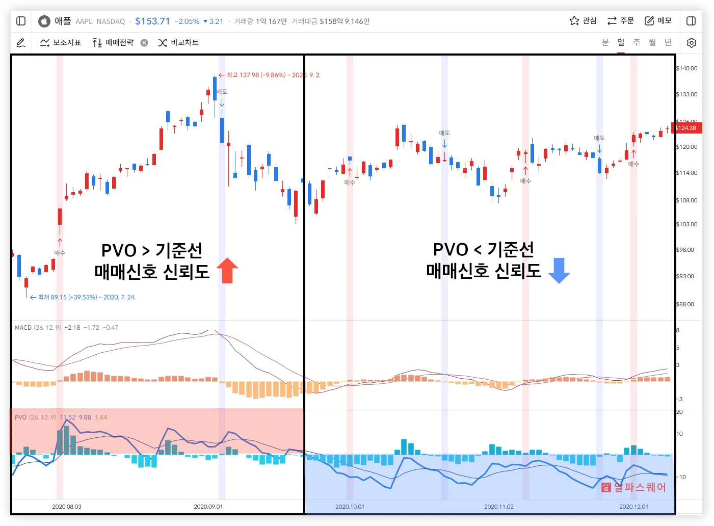 거래량은 주가에 선행하는 특성을 가지고있다. 따라서 추세 지표에서 추세가 반전되거나 강화되는 신호를 포착했을 때 PVO를 함께 활용하면 신호의 신뢰성을 높이거나 낮출 수 있다.