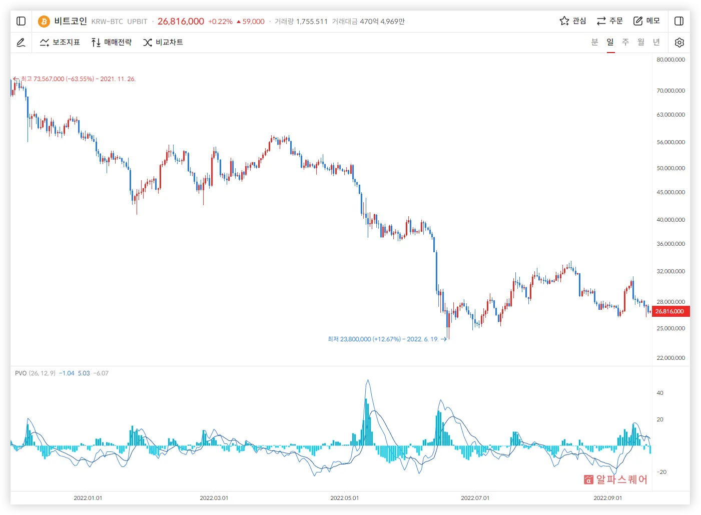 이와 반대로 PVO선이 Signal선을 하향 돌파하면 현재 PVO가 감소하고있다는 의미이고, PVO가 0보다 작다면 이는 추세의 약화라고 생각할 수 있다.