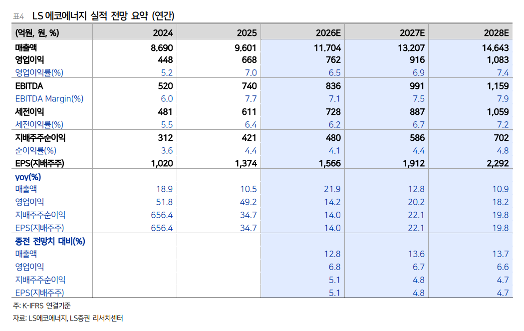 1Q26 연결 매출은 2,964억원, 영업이익은 201억원, 영업이익률은 6.8%였다. 전년 동기 대비 매출은 30%, 영업이익은 31% 증가했고 컨센서스와 증권사 전망을 모두 크게 웃돌았다. 특히 베트남 북부법인 LS-VINA가 매출 3,068억원, 영업이익 169억원으로 초고압 케이블과 소재 사업 호조를 보였고, 남부법인 LSCV도 미국향 UTP 케이블 관세 영향에도 불구하고 예상보다 나은 수익성을 냈다.