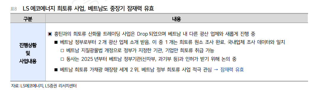 희토류 사업은 Lynas에서 희토류 산화물을 공급받아 LSCV 부지에 금속공장을 세우는 방향이 구체화되고 있다. 2026년 상반기 파일럿 설비를 구축하고, 2026년 말에서 2027년 초 초도물량 생산을 목표로 한다. 아직 계약 세부 내용과 설비 투자 진행을 더 봐야 하지만, 단순 테마가 아니라 실제 공급망 편입 가능성이 드러난 점은 분명 긍정적이다.