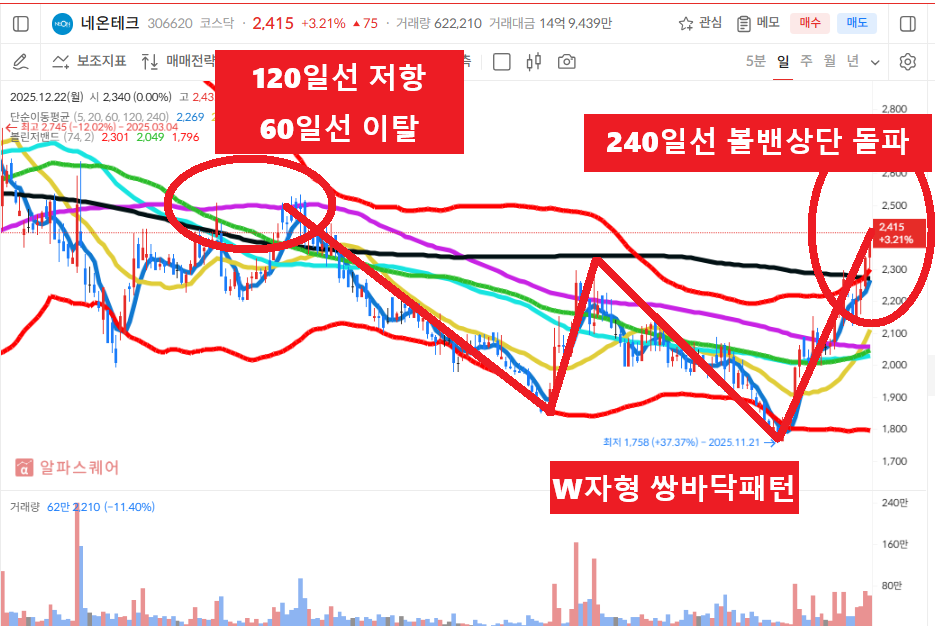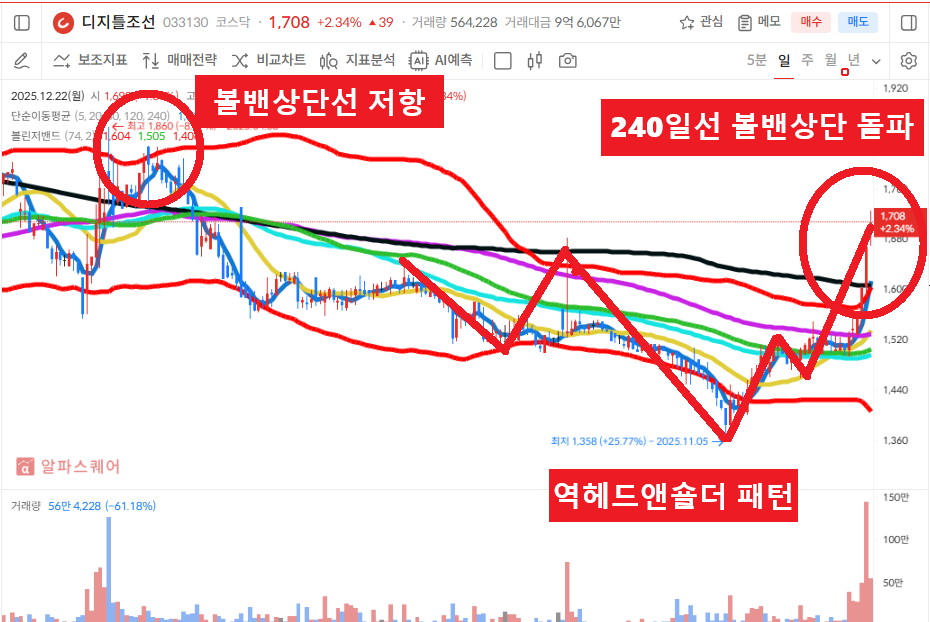 ■ 에셋마스터의 [1] 돌고래차트는 매매기준. - 60일선을 이탈하고 급격하게 하락하던 주가가(가격조정,기간조정) 하락을 멈추고 캔들이 5일선을 돌파 후 안착하고, 5일선은 20일선을 골든크로스 해주어야 합니다. 다음날 혹은 그다음 날 5일선 지지선에서 매수 걸고 기다리는데, 이때 60일선 이탈 이후 급격한 하락은 신뢰도가 높습니다. - 참고, 20일선 이탈 시 손절잡고 진행하는 기준입니다. #돌고래차트 #주식투자 #주식공부 #주식공부방 ■ 에셋마스터의 [2] 볼린져밴드 돌고래차트 매매기준. 볼린져밴드 기간을 74로 설정하고, 캔들이 설정한 볼린져밴드 상단선을 돌파해 주어야 합니다. 이때 5일선이 볼린져밴드 상단선을 골든크로스 해주어야 신뢰도가 높습니다. 5일선이 볼밴상단선을 돌파하고 5일선 지지선에서 매수 기준을 잡습니다. -참고. 수익 중이면 5일선이탈시 비중축소 볼밴이탈시 올매도 기준입니다. 손실 중이면 볼밴상단선 이탈 시 손절선을 잡습니다. #볼밴돌고래차트 #주식공부방 #주린이공부 ■ 돌고래차트 매매는 항상 분할매수(2회~3회)를 원칙으로 합니다. 주식공부방 기준은 1차매수 2차매수로 나눠서하는 투자를 원칙으로 하며, 1차 돌고래차트 만들고, 이탈하면 2차매수도 돌고래차트를 재차 만들때 재투입합니다. #주식투자시 분할매수를 못하면 주식에서 실패할 수 밖에 없습니다. ■ 수익금은 꼭 인출해서 별도의 CMA계좌로 옮겨두세요.. 이후 폭락장(개인들의 반대매매가 나오는시점)이 오면 그때 재투자를 원칙으로 합니다. ■ 본 내용은 에셋마스터가 직접 #주식공부하는 내용을 공유하여 올려드리는 것입니다. ["일정한 대가를 받고 주식에 대한 종목 추천이나 1:1 리딩은 절대 하지 않습니다".] 주식투자에 대한 교육 차원이며 종목 추천을 드리는 것이 아님을 꼭 밝혀드리고, 주식투자에 대한 수익이나 손실은 본인의 몫임을 말씀드립니다. ■ #주식투자에 앞서 #주식공부는 증권사의 모의투자로 본인의 실력을 향상시키는 것을 먼저 권유 드립니다. #네온테크 #차트분석 #기술적분석 반도체, 디스플레이, MLCC용 절단 장비 제조 및 판매를 주 영업목적으로 운영하고 있는 시가총액 1087억원의 코스닥 상장기업입니다. 단기 상승이후 볼린져밴드 상단선을 이탈하고 장기 이평선 240일선을 이탈하면서 가격조정을 받아오던 주가는 하락을 멈추고 5일선이 20일선을 골든크로스하고 240일선과 120일선의 저항선에서 재차 가격조정을 받고 있습니다. 가격조정을 받고 하락하던 주가는 쌍바닥 패턴의 W자형 모형을 만들고 단기 상승흐름을 보여주는 상황에서 장기이평선 240일선과 볼린져밴드 상단선을 돌파하는 모습을 보여주고 있습니다. 매수밴드 5일선과 240일선의 지지선에서 흐름지켜보고 240일선 이탈시 손절선 잡아보겠습니다. #네온테크 #재무분석 #기본적분석 네온테크의 매출액은 2022년 529억원에서 2024년 1045억원으로 증가하고 있으며, 당기순이익은 2022년 -81억원에서 2024년 3억원으로 흑자전환해 주고 있습니다. 부채비율은 2022년 100%에서 2024년 139%로 증가하고 있으며, 유보율은 2022년 667%에서 2024년 580%로 감소하고 있습니다. #네온테크 #시장이슈및테마 #드론관련주 #적층세라믹콘덴서관련주 #LED관련주로 엮여 있는 상황에서 이슈받는지 흐름지켜보겠습니다. #디지틀조선 #차트분석 #기술적분석 인터넷사업, 영상사업, 전산사업, 교육사업, 기타사업등을 영위하고 있으며, 업계 최초로 CTS, 인쇄 및 발송 등 신문제작의 전 과정에 자동화 시스템을 구축하고 있는 시가총액 631억원의 코스닥 상장기업입니다. 볼린져밴드 상단선의 저항선까지 단기 반등이후 저항선을 돌파하지 못하고 급격하게 가격조정을 받으면서 하락하는 모습을 보여주고 있습니다. 급격하게 조정을 받고 하락하는 차트 상황에서 역헤드앤숄더 패턴을만들고 60일선의 지지선에서 반등하면서 장기이평선 240일선과 볼린져밴드 상단선을 돌파하는 모습을 보여주고 있습니다. #매수밴드 5일선과 240일선의 지지지선에서 흐름지켜보고 240일선 이탈시 손절선 잡아보겠습니다. #디지틀조선 #재무분석 #기본적분석 #디지틀조선의 매출액은 2022년 347억원에서 2024년 370억원으로 증가하고 있으며, 당기순이익은 2022년 27억원에서 2024년 38억원으로 증가하고 있습니다. 부채비율은 2022년 10%에서 2024년 11%로 횡보하고 있으며, 유보율은 2022년 332%에서 2024년 363%로 증가하고 있습니다. #디지틀조선 #시장이슈및테마 #정치테마관련주 #김무성관련주 #홍정욱관련주 #미디어관련주로 엮여 있는 상황에서 이슈받는지 흐름지켜보겠습니다. #네이버에서 에셋마스터 #돌고래차트 #야구공주식이론 #주식공부방 #볼린져밴드설정 #5일선매매기법
