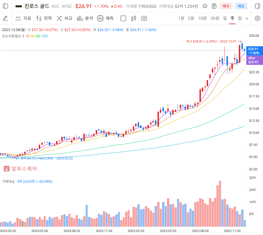 마지막 세 번째 금 관련주는 캐나다의 대표 광산 기업, 킨로스 골드 (Kinross Gold, 티커: KGC)입니다.