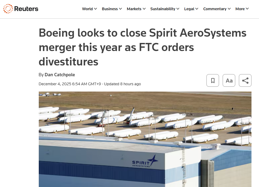 Source : https://www.reuters.com/sustainability/boards-policy-regulation/us-ftc-says-boeing-must-divest-spirit-aerosystems-assets-proceed-with-merger-2025-12-03/