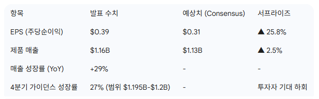 뉴스 요약 : 클라우드 데이터 플랫폼 기업 스노우플레이크(Snowflake)가 시장 예상치를 상회하는 3분기 실적을 발표했음에도 불구하고, 주가는 시간 외 거래에서 급락하는 모습을 보였음. 3분기 제품 매출은 9억 9,680만 달러로 전년 동기 대비 29% 성장하며 예상치를 웃돌았고, 주당 순이익(EPS)도 0.39달러로 시장 예상치인 0.31달러를 크게 상회했음.