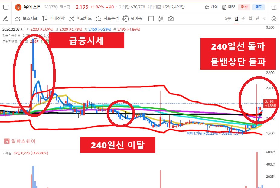 ■ 에셋마스터의 [1] 돌고래차트는 매매기준. - 60일선을 이탈하고 급격하게 하락하던 주가가(가격조정,기간조정) 하락을 멈추고 캔들이 5일선을 돌파 후 안착하고, 5일선은 20일선을 골든크로스 해주어야 합니다. 다음날 혹은 그다음 날 5일선 지지선에서 매수 걸고 기다리는데, 이때 60일선 이탈 이후 급격한 하락은 신뢰도가 높습니다. - 참고, 20일선 이탈 시 손절잡고 진행하는 기준입니다. #돌고래차트 #주식투자 #주식공부 #주식공부방 ■ 에셋마스터의 [2] 볼린져밴드 돌고래차트 매매기준. 볼린져밴드 기간을 74로 설정하고, 캔들이 설정한 볼린져밴드 상단선을 돌파해 주어야 합니다. 이때 5일선이 볼린져밴드 상단선을 골든크로스 해주어야 신뢰도가 높습니다. 5일선이 볼밴상단선을 돌파하고 5일선 지지선에서 매수 기준을 잡습니다. -참고. 수익 중이면 5일선이탈시 비중축소 볼밴이탈시 올매도 기준입니다. 손실 중이면 볼밴상단선 이탈 시 손절선을 잡습니다. #볼밴돌고래차트 #주식공부방 #주린이공부 ■ 돌고래차트 매매는 항상 분할매수(2회~3회)를 원칙으로 합니다. 주식공부방 기준은 1차매수 2차매수로 나눠서하는 투자를 원칙으로 하며, 1차 돌고래차트 만들고, 이탈하면 2차매수도 돌고래차트를 재차 만들때 재투입합니다. #주식투자시 분할매수를 못하면 주식에서 실패할 수 밖에 없습니다. ■ 수익금은 꼭 인출해서 별도의 CMA계좌로 옮겨두세요.. 이후 폭락장(개인들의 반대매매가 나오는시점)이 오면 그때 재투자를 원칙으로 합니다. ■ 본 내용은 에셋마스터가 직접 #주식공부하는 내용을 공유하여 올려드리는 것입니다. ["일정한 대가를 받고 주식에 대한 종목 추천이나 1:1 리딩은 절대 하지 않습니다".] 주식투자에 대한 교육 차원이며 종목 추천을 드리는 것이 아님을 꼭 밝혀드리고, 주식투자에 대한 수익이나 손실은 본인의 몫임을 말씀드립니다. ■ #주식투자에 앞서 #주식공부는 증권사의 모의투자로 본인의 실력을 향상시키는 것을 먼저 권유 드립니다. #유에스티 #차트분석 #기술적분석 스테인리스 강관 제작 및 판매업을 영위하고 있는 시가총액 520억원의 코스닥 상장기업입니다. 거래량없이 횡보하던 주가는 상한가 마감이후 갭상승음봉으로 마감하면서 가격조정을 받고 단기 기간조정을 받는 상황에서 240일선을 이탈하면서 조정을 받고 있습니다. 240일선이탈이후 거래량없이 기간조정을 받고 하락하던 주가는 거래량을 동반하면서 급등시세이후 볼린져밴드 상단선을 돌파하고 240일선을 돌파 안착하는 상황에서 5일선이 우상향중에 있습니다. 매수밴드 5일선과 볼린져밴드 상단선의 지지선에서 흐름지켜보고 240일선 이탈시 손절선 잡아보겠습니다. #유에스티 #재무분석 #기본적분석 유에스티의 매출액은 2022년 999억원에서 2024년 748억원으로 감소하고 있으며, 당기순이익은 2022년 125억원에서 2024년 55억원으로 감소하고 있습니다. 부채비율은 2022년 26%에서 2024년 11%로 감소하고 있으며, 유보율은 2022년 2833%에서 20224년 3362%로 증가하고 있습니다. #유에스티 #시장이슈및테마 #니켈관련주 #2차전지관련주 #전기차관련주로 엮여 있는 상황에서 이슈받는지 흐름지켜보겠습니다. #네이버에서 에셋마스터 #돌고래차트 #야구공주식이론 #주식공부방 #볼린져밴드설정 #5일선매매기법