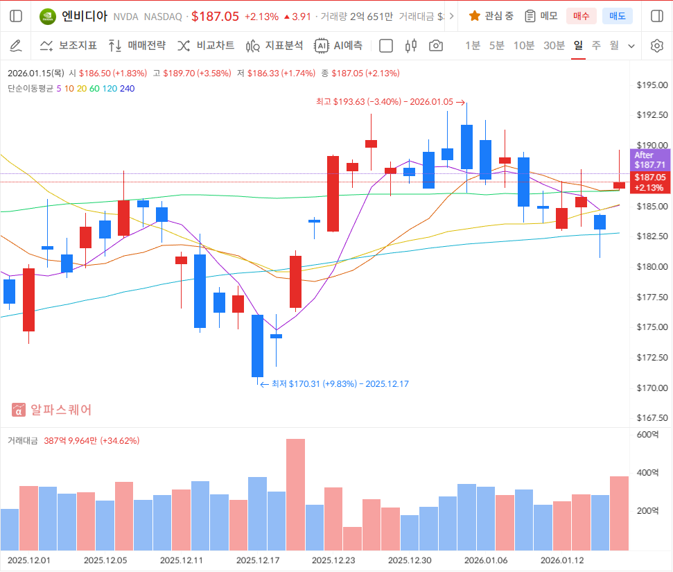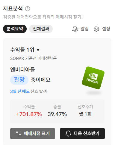 특히 여러분이 보유한 엔비디아 주가 전망과 향후 적정 매수/매도 타이밍을 보다 전문적으로 파악하고 싶다면, 알파스퀘어의 지표분석 서비스 활용해 보시는 걸 추천드립니다. 깔끔하네요.ㅎ