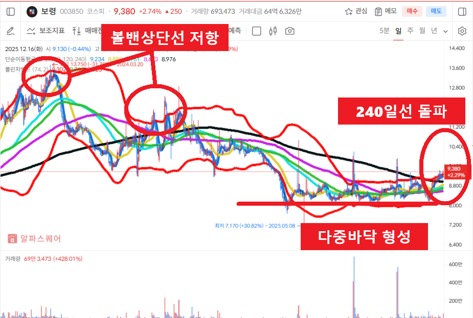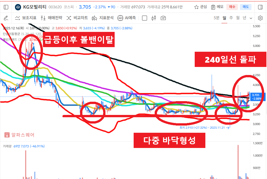 ■ 에셋마스터의 [1] 돌고래차트는 매매기준. - 60일선을 이탈하고 급격하게 하락하던 주가가(가격조정,기간조정) 하락을 멈추고 캔들이 5일선을 돌파 후 안착하고, 5일선은 20일선을 골든크로스 해주어야 합니다. 다음날 혹은 그다음 날 5일선 지지선에서 매수 걸고 기다리는데, 이때 60일선 이탈 이후 급격한 하락은 신뢰도가 높습니다. - 참고, 20일선 이탈 시 손절잡고 진행하는 기준입니다. #돌고래차트 #주식투자 #주식공부 #주식공부방 ■ 에셋마스터의 [2] 볼린져밴드 돌고래차트 매매기준. 볼린져밴드 기간을 69로 설정하고, 캔들이 설정한 볼린져밴드 상단선을 돌파해 주어야 합니다. 이때 5일선이 볼린져밴드 상단선을 골든크로스 해주어야 신뢰도가 높습니다. 5일선이 볼밴상단선을 돌파하고 5일선 지지선에서 매수 기준을 잡습니다. -참고. 수익 중이면 5일선이탈시 비중축소 볼밴이탈시 올매도 기준입니다. 손실 중이면 볼밴상단선 이탈 시 손절선을 잡습니다. #볼밴돌고래차트 #주식공부방 #주린이공부 ■ 돌고래차트 매매는 항상 분할매수(2회~3회)를 원칙으로 합니다. 주식공부방 기준은 1차매수 2차매수로 나눠서하는 투자를 원칙으로 하며, 1차 돌고래차트 만들고, 이탈하면 2차매수도 돌고래차트를 재차 만들때 재투입합니다. #주식투자시 분할매수를 못하면 주식에서 실패할 수 밖에 없습니다. ■ 수익금은 꼭 인출해서 별도의 CMA계좌로 옮겨두세요.. 이후 폭락장(개인들의 반대매매가 나오는시점)이 오면 그때 재투자를 원칙으로 합니다. ■ 본 내용은 에셋마스터가 직접 #주식공부하는 내용을 공유하여 올려드리는 것입니다. ["일정한 대가를 받고 주식에 대한 종목 추천이나 1:1 리딩은 절대 하지 않습니다".] 주식투자에 대한 교육 차원이며 종목 추천을 드리는 것이 아님을 꼭 밝혀드리고, 주식투자에 대한 수익이나 손실은 본인의 몫임을 말씀드립니다. ■ #주식투자에 앞서 #주식공부는 증권사의 모의투자로 본인의 실력을 향상시키는 것을 먼저 권유 드립니다. #KG모빌리티 #차트분석 #기술적분석 완성차의 생산 및 판매업을 하고있으며, 경기도 평택공장에서 SUV 및 픽업트럭, 창원공장에서 가솔린, 디젤엔진을 생산하는 국내 유일 SUV전문기업으로 시가총액 7467억원의 코스피 상장기업입니다. 36000원부터 급격하게 가격조정을 받으면서 꾸준하게 하락하는 주가는 역배열로 하락는 모습을 보여주고 있습니다. 추세역배열로 하락하면서 240일선의 저항선을 돌파하지 못하고 주주를 피말리게 하는 상황이였습니다. 최근 가격조정을 마무리하고 기간조정을로 횡보하는 상황에서 다중바닥을 만들어주고 이평선이 밀집된 상황에서 장기이평선 240일선을 돌파하는 상황에서 이평선 확장하는 초입자리로 보여지고 있습니다. 좀더 상승을 해준다면 추세전환으로 상승으로 갈수 있는 차트인데, 4000원까지 5일선이 올라와준다면 추세전환으로 볼수 있습니다. 매수밴드 5일선과 240일선의 지지선에서 흐름지켜보고 240일선 이탈시 손절선 잡아보겠습니다. #KG모빌리티 #재무분석 #기본적분석 KG모빌리티의 매출액은 2022년 3조 4233억원에서 2024년 3조 9051억원으로 증가하고 있으며, 당기순이익은 2022년 -601억원에서 2024년 338억원으로 흑자전환해 주고 있습니다. 부채비율은 2022년 83%에서 2024년 118%로 증가하고 있으며, 유보율은 2022년 -5%에서 2024년 -5%로 횡보하고 있으나 2025년 분기보고서상 유보율이 증가하는 것을 확인할수 있습니다. #KG모빌리티 #시장이슈및테마 #전기차관련주 #수소차관련주 #테슬라전기차관련주로 엮여 있는 상황에서 이슈받는지 흐름지켜보겠습니다. #보령 #차트분석 #기술적분석 의약품 제조 및 판매업을 영위하고 있으며, 만성대사진환, 항암 영역의 점유율을 확대하고 있으며, 해외 매출 증가를 위해 글로벌 제약사의 우수의약품 도입 및 유먕 개량신약의 개발을 추진하고있는 시가총액 7952억원의 코스피 상장기업입니다. 가격조정을 받으면서 하락하던 주가는 하락을 멈추고 5일선이 20일선 60일선을 골든크르소하면서 추세 우상향으로 상승하던 주가는 볼린져밴드 상단선의 저항선에서 돌파하지 못하고 이탈하하면서 조정을 받고 하락하는 상황에서 재차 바닥을 다지고 상승하는 상황에서 볼린져밴드 상단선에서 조정을 받고 있는 모습입니다. 볼린져밴드 상단선의 저항선에서 조정을 받고 60일선을 이탈하면서 하락하던 주가는 하락을 멈추고 5일선이 20일선을 골든크로스이후 반짝 상승하는 모습을 보여주고 있으나 전저점의 지지선에서 다중바닥을 만들어주고 최근 240일선의 장기이평선을 돌파하는 모습을 보여주고 있습니다. 매수밴드 5일선과 240일선의 지지선에서 흐름지켜보고 240일선 이탈시 손절선 잡아보겠습니다. #보령 #재무분석 #기본적분석 보령의 매출액은 2022년 7605억원에서 2024년 1조 171억원으로 증가하고 있으며, 당기순이익은 2022년 419억원에서 2024년 696억원으로 증가하고 있습니다. 부채비율은 2022년 72%에서 2024년 48%로 감소하고 있으며, 유보율은 2022년 1467%에서 2024년 1751%로 증가하고 있습니다. #보령 #시장이슈및테마 #면역항암제관련주 #치매관련주 #탈모관련주 #우주항공관련