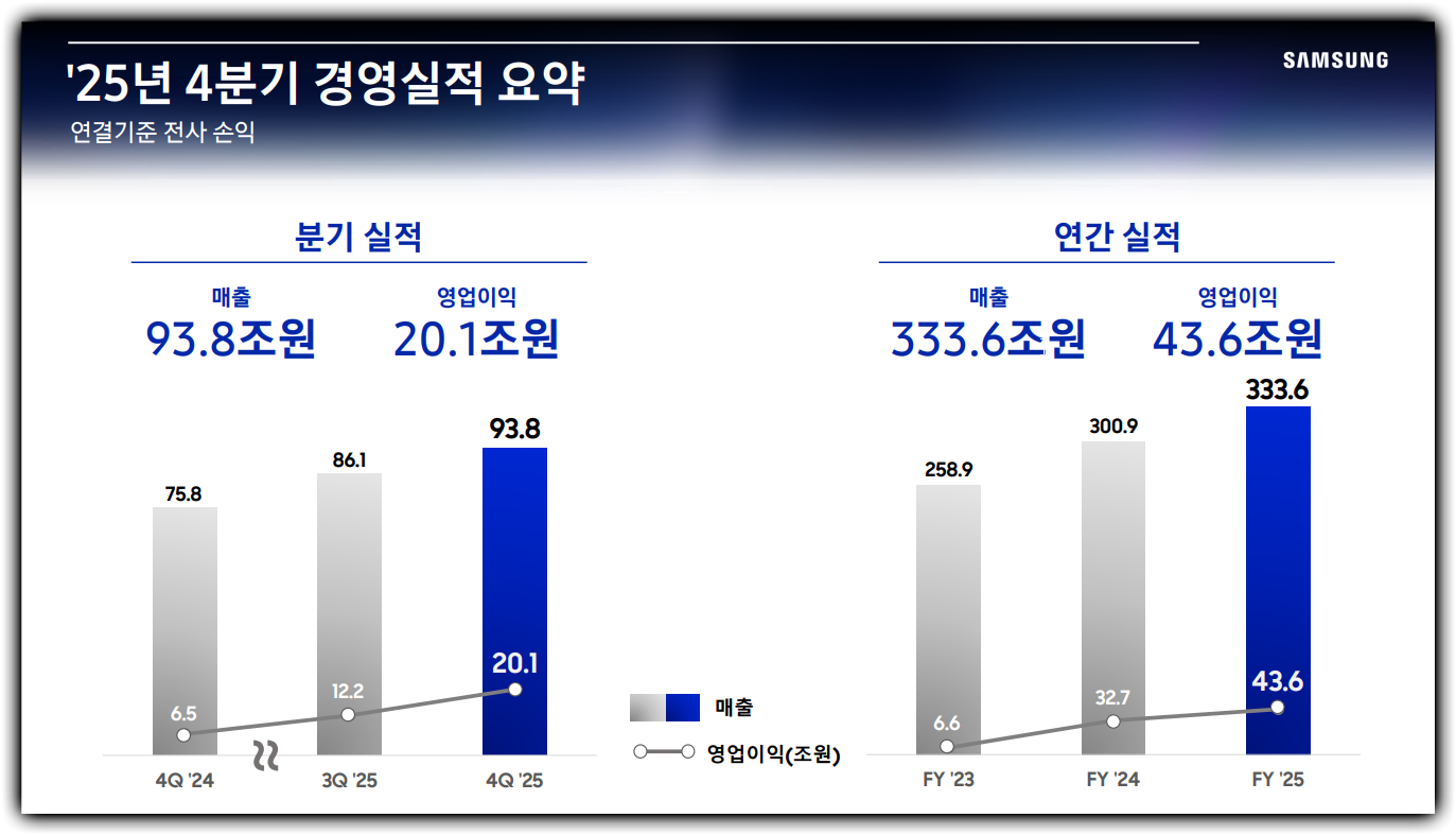 삼성전자 는 인공지능(AI) 수요 폭발에 힘입어 2026년 매출 480조 원, 영업이익 최대 180조 원이라는 경이로운 성적표를 거둘 것으로 보입니다. 지난 4분기(4Q25) 성적만 봐도 이미 조짐이 보입니다. 영업이익이 전 분기 대비 약 8조 원 가까이 늘어난 20.1조 원을 기록했는데, 이는 반도체(DS) 부문이 실적 개선을 강하게 견인했기 때문입니다.