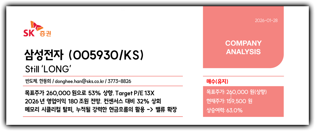 SK증권은 더 공격적입니다. 목표주가 26만 원은 2026년 예상 주당순이익(EPS, 주식 1주가 벌어들인 이익)에 목표 P/E(주가수익비율) 13배를 적용한 수치입니다. "전통적인 사이클 논리로 고점을 논하지 마라"며, 강력한 현금흐름이 주주환원(배당 등)이나 M&A(기업 인수합병)로 이어져 기업 가치가 한 단계 더 점프할 것이라고 강조합니다.