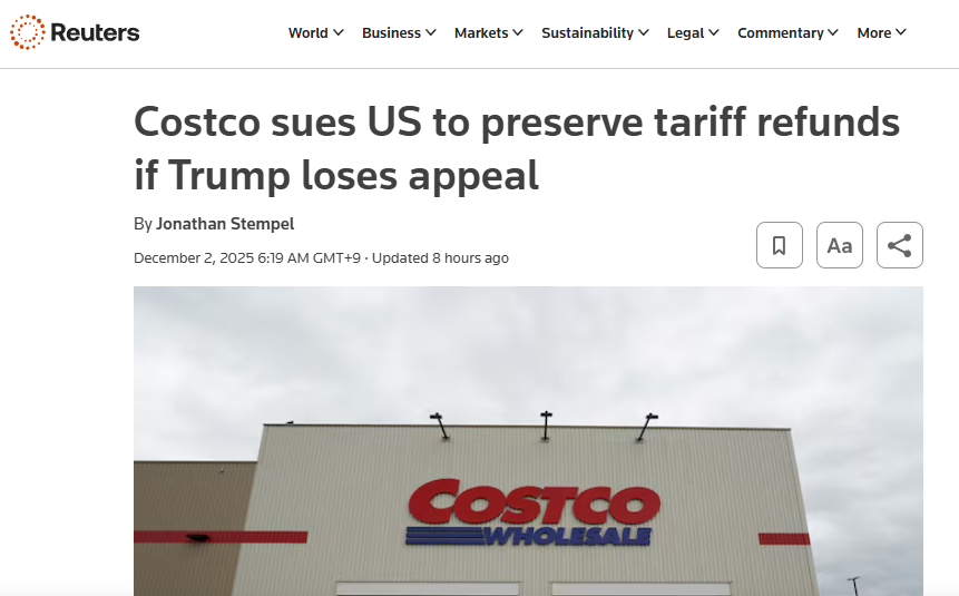Source : https://www.reuters.com/legal/government/costco-sues-us-preserve-tariff-refunds-if-trump-loses-appeal-2025-12-01/