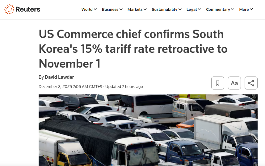 Source : https://www.reuters.com/business/autos-transportation/us-commerce-chief-confirms-south-koreas-15-tariff-rate-retroactive-november-1-2025-12-01/