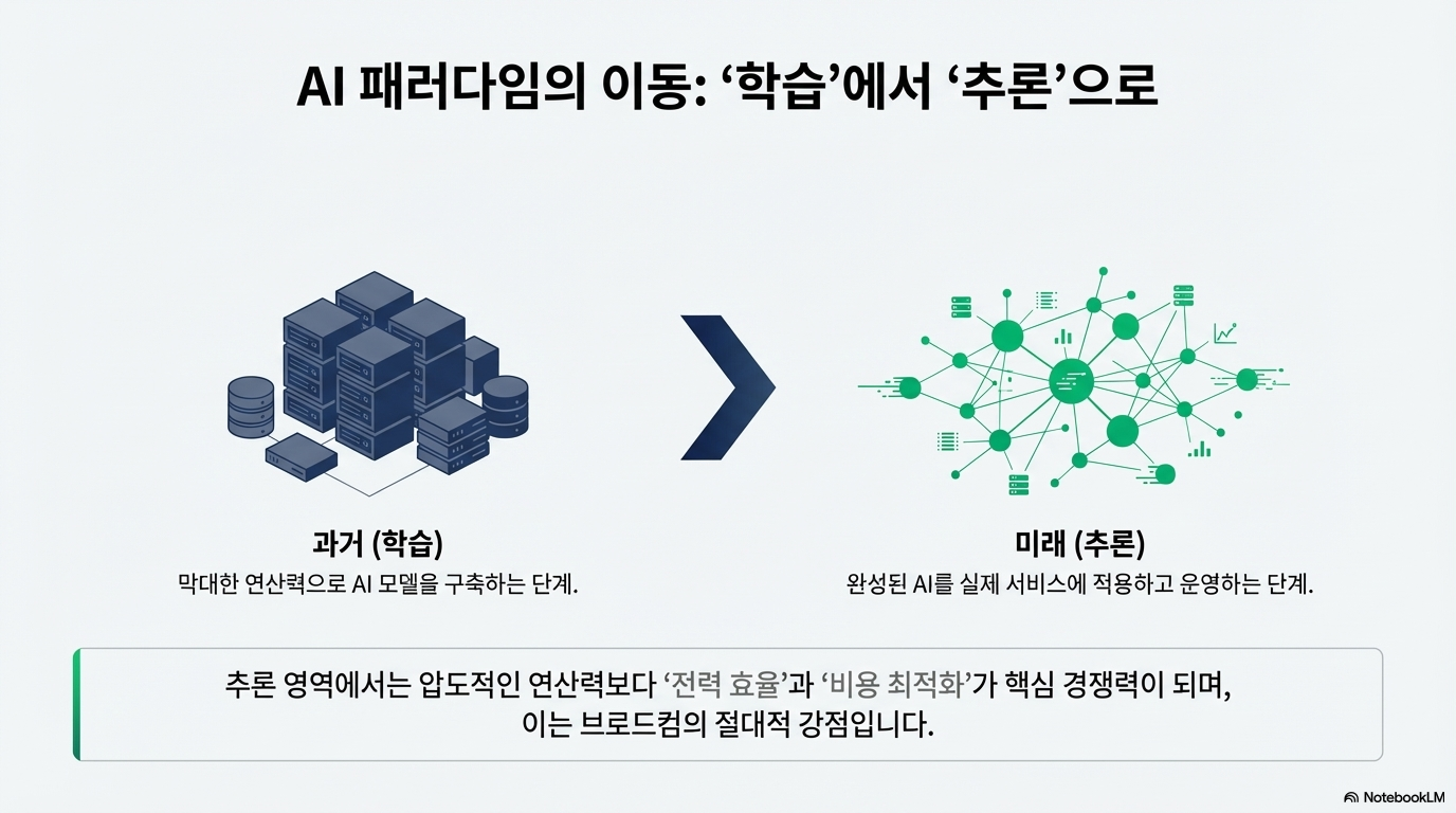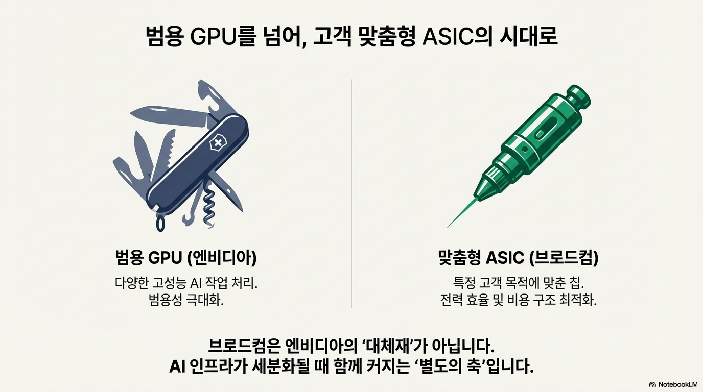 브로드컴의 강점은 범용 GPU가 아니라 고객 맞춤형 ASIC에 있습니다. 쉽게 말하면 엔비디아가 다양한 AI 작업을 처리하는 범용 고성능 칩에 강하다면, 브로드컴은 특정 고객이 원하는 목적에 맞춰 전력 효율과 비용 구조를 최적화한 칩을 만드는 쪽에 강합니다. AI 산업이 초반에는 학습(training) 중심이었다면, 앞으로는 실제 서비스에 적용하는 추론(inference) 비중이 커질 가능성이 높은데, 이 구간에서는 브로드컴 같은 ASIC 업체의 존재감이 더 커질 수 있습니다.