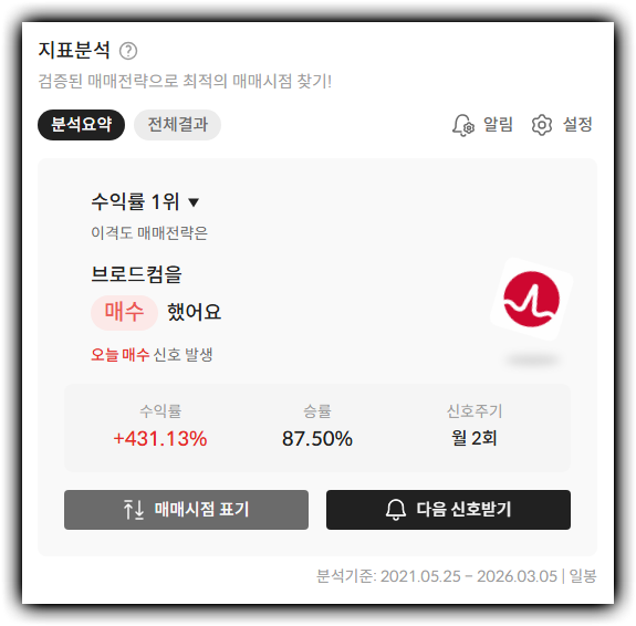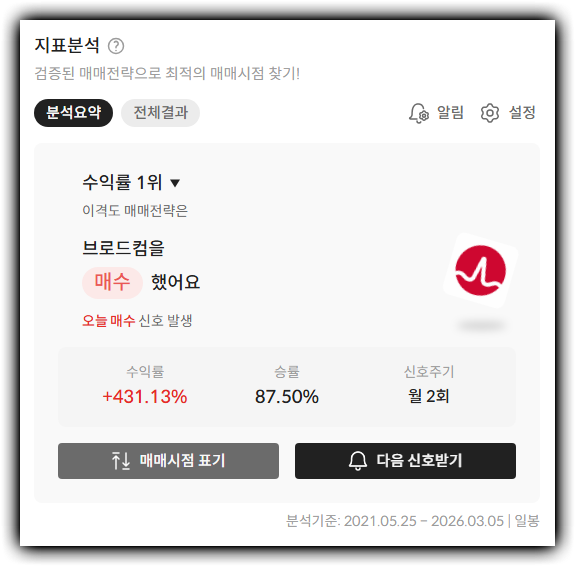 이 지점에서 알파스퀘어 지표분석이 실전적으로 연결됩니다. 알파스퀘어 지표분석은 43개의 매매 전략을 바탕으로 내가 보고 있는 종목에 어떤 전략이 더 잘 맞았는지, 또 과거 수익률이 높았던 방식이 무엇이었는지를 비교해볼 수 있는 도구입니다. 브로드컴처럼 성장 서사가 강하지만 변동성도 큰 종목은 숫자만 보고 들어가면 타이밍이 꼬이기 쉬운데, 이런 분석 도구를 함께 보면 매수 구간과 대응 시나리오를 더 차분하게 정리할 수 있습니다.