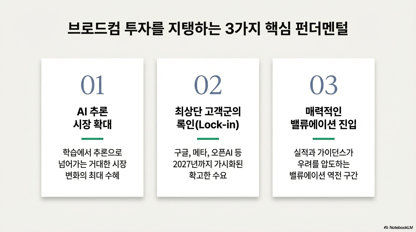첫째, 브로드컴은 AI 추론 시장이 커질수록 수혜를 받을 가능성이 높습니다. 둘째, 브로드컴 고객군은 이미 업계 최상단에 있고, 2027년까지의 투자 방향도 어느 정도 보입니다. 셋째, 브로드컴 주가는 한 차례 불안 심리로 눌렸지만 실적과 가이던스가 그 우려를 다시 되돌리는 중입니다. 결국 브로드컴은 “엔비디아의 대체재”라기보다, AI 인프라가 더 세분화될 때 함께 커질 수 있는 별도의 축으로 보는 해석이 더 맞아 보입니다.