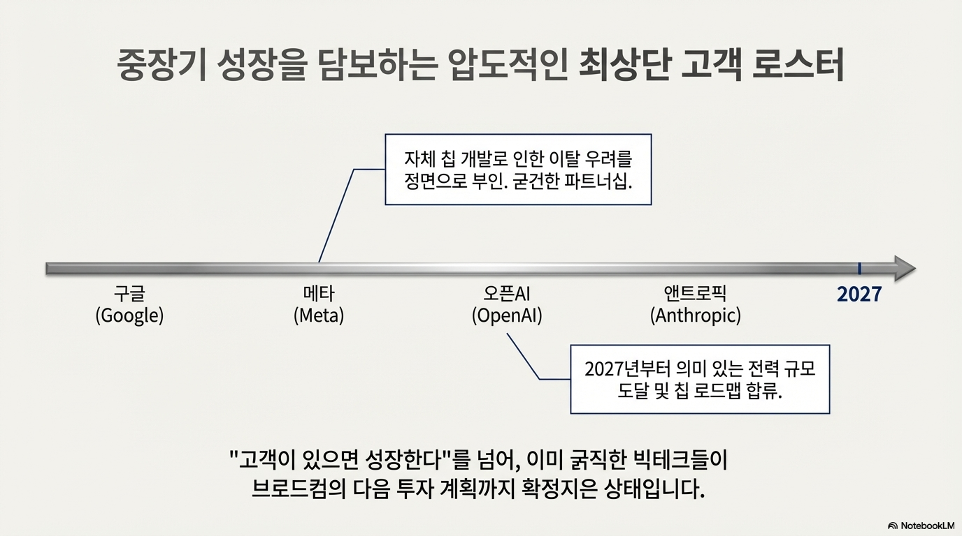 브로드컴 스토리가 더 강한 이유는 고객의 질에 있습니다. 구글, 메타, 오픈AI, 앤트로픽 등 대형 고객이 이미 ASIC 확대에 들어가 있다는 점은 단순 기대감보다 훨씬 무거운 신호로 읽힙니다. 특히 메타의 자체 칩 로드맵 우려를 회사가 정면으로 부인했고, 오픈AI까지 2027년부터 의미 있는 전력 규모로 올라올 가능성을 언급한 점은 브로드컴의 중장기 매출 가시성을 높여주는 재료입니다. 한마디로 브로드컴 은 “고객이 있으면 성장한다”가 아니라, 이미 굵직한 고객이 다음 투자 계획까지 보여주고 있는 단계에 가까워 보입니다.