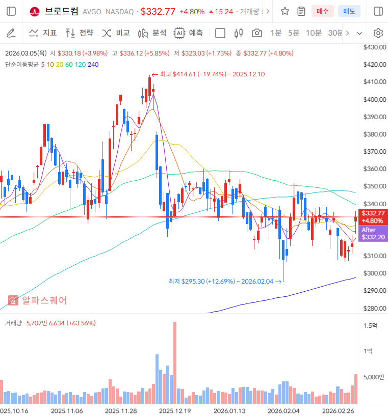 브로드컴의 기술적 흐름만 짧게 보면, 최근 조정 이후 주요 지지 구간을 확인하고 실적 발표로 반등 신호가 다시 붙는 모습입니다. 거래량이 실린 반등이 이어지면 이전 고점 재도전 가능성도 열리지만, 단기 급등 뒤 흔들림은 여전히 감안해야 합니다. 이런 구간에서는 가격 추세, 지지선·저항선, 거래량을 함께 보는 게 중요해서 많은 투자자들이 알파스퀘어 지표분석을 참고합니다.