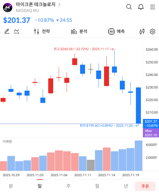 마이크론 -10% 폭락, 7% 하락, 4% 하락 등 미국 반도체 업종이 하루 만에 크게 밀리면서 글로벌 반도체 심리가 순식간에 냉각되었습니다. 한국 반도체 업종은 미국 시장에 연동되는 경향이 강하기 때문에, 와 엔비디아가 흔들리면 삼성전자 하락 압력은 더욱 거세지는 경향이 있습니다. 미 증시에서 이미 단기 고평가 부담이 불거진 만큼 기술주 중심의 조정은 코스피에도 그대로 반영되었고, 이날 삼성전자 하락은 단순한 종목 이슈가 아니라 섹터 전체의 리스크 회피 성향이 확대된 결과라고 볼 수 있겠습니다.