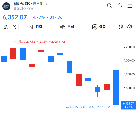 삼성전자 하락 흐름을 이해하려면 먼저 시장 전체의 흐름을 봐야 합니다. 11월 21일 새벽 뉴욕 시장에서는 엔비디아의 호실적에도 불구하고 기술주 전반이 급락했고, 이 여파가 한국 반도체 업종 전반으로 확산되며 삼성전자 하락을 부추겼습니다. 필라델피아 반도체 지수가 하루 만에 -4% 넘게 하락하면서 글로벌 투자 심리가 위축됐고, 이는 코스피 시가총액 1위인 삼성전자에 가장 직접적인 하방 압력으로 작용했습니다. 특히 외국인 수급이 급격히 빠져나가면서 국내 투자자들도 동요하는 모습이 뚜렷하게 나타났습니다.