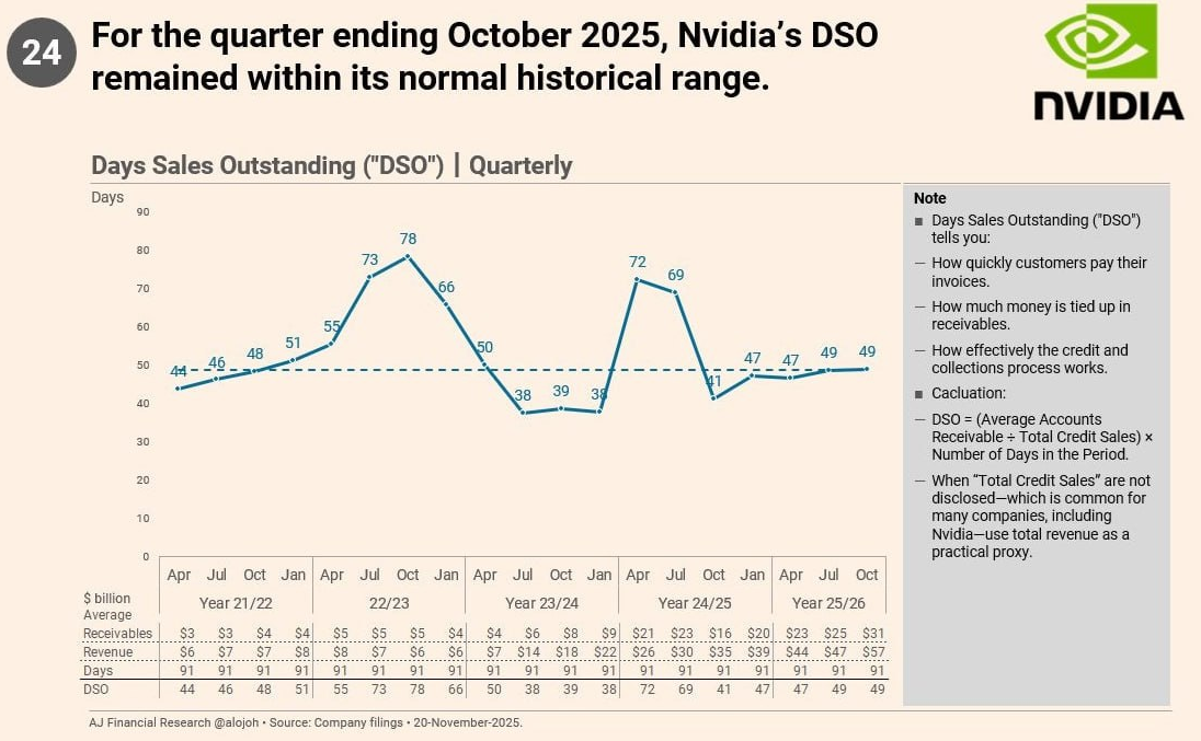 삼성전자 하락의 또 다른 간접적 요인은 [엔비디아 매출채권 증가]에 대한 오해에서 비롯되었습니다. 인터넷에서는 엔비디아 AR이 334억 달러로 급증했다는 사실만 부각되며 “수요가 줄어드는 것 아니냐”, “돈을 못 받고 있다”는 식의 우려가 확산되었습니다. 한국 반도체 관련주 투자 심리와 삼성전자 주가도 이 노이즈에서 자유로울 수 없었습니다. 하지만 실제 재무 분석에서는 DSO(매출채권 회수일) 지표가 49일로 오히려 과거보다 안정적이며, NVL72 랙 시스템 출하가 늘어나면서 ODM(폭스콘, 콴타 등)의 운전자본이 증가한 자연스러운 현상이라는 반박이 나왔습니다. 즉, 실질 리스크는 없는데도 과도한 공포가 삼성전자 하락을 이끈 셈입니다. 따라서 지금 매도분위기에 휩쓸려 즉석으로 매도하기보다는, 상황을 지켜보면서 대응 하는 편이 합리적인 판단입니다.