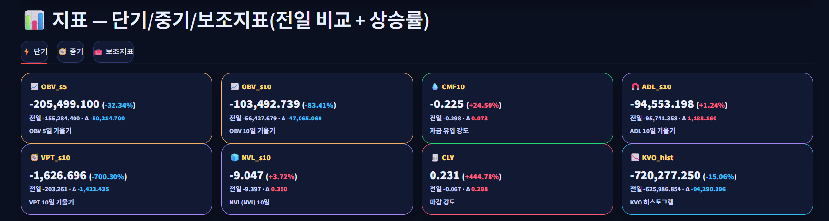 OBV_s5 -205,499.1(-50,214.7), **OBV_s10 -103,492.739(-47,065.06)**로 단기 누적이 감소 방향입니다.
