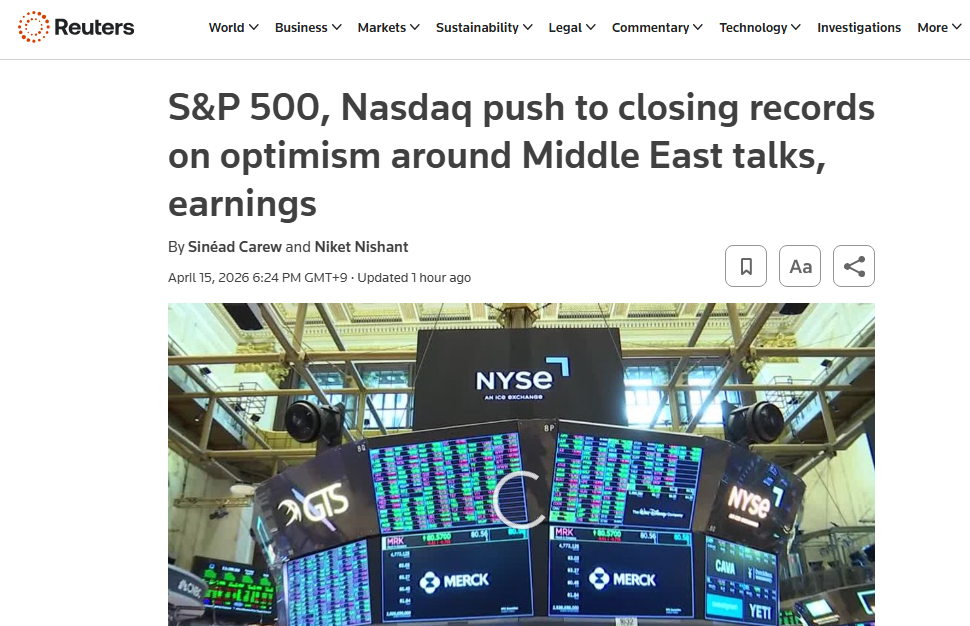 ✔ 중동 협상 기대와 실적 시즌에 S&P500·나스닥 종가 최고치 경신