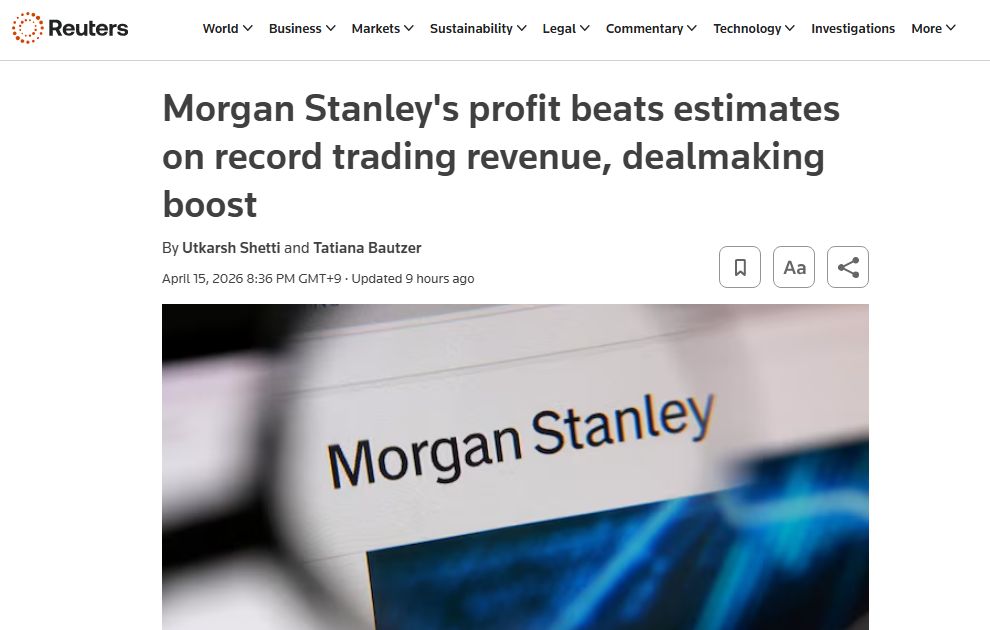 ✔ 모건스탠리, 사상 최대 주식 트레이딩 수익과 딜 증가로 호실적