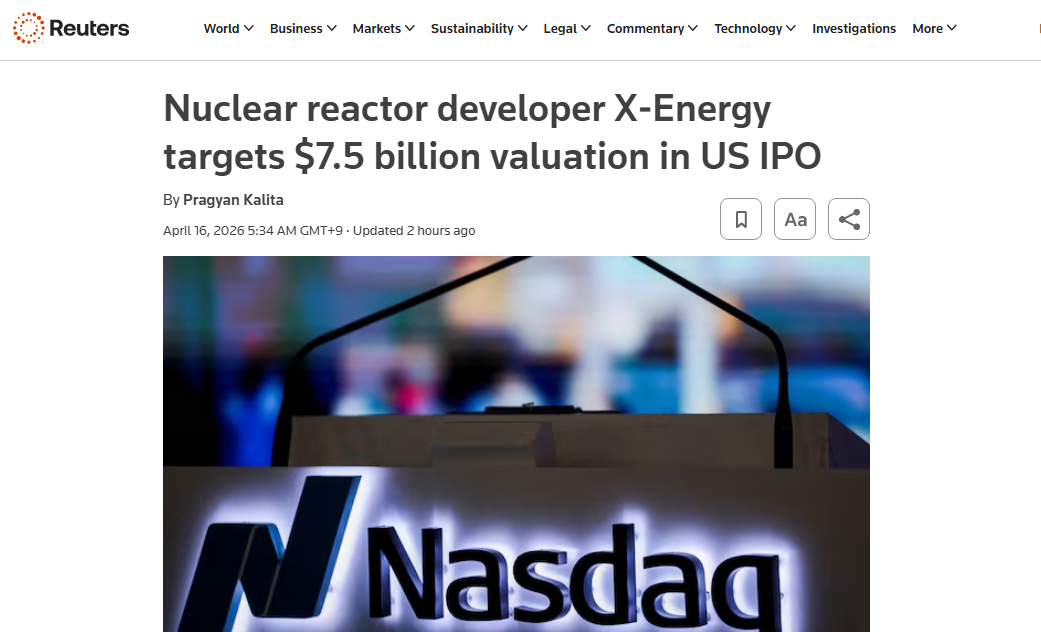✔ 소형원전 개발사 X-에너지, 75억달러 가치 목표로 미국 IPO 추진