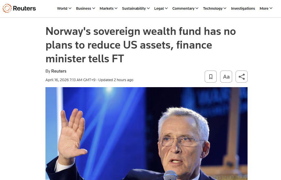 ✔ 노르웨이 국부펀드, 미국 자산 비중 축소 계획 없다고 재확인