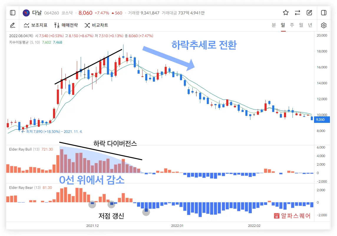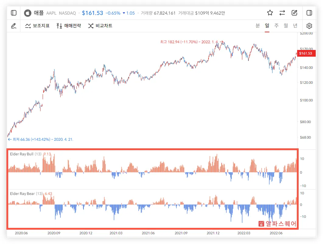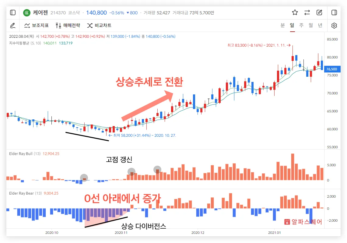 💡 Elder Ray Index는 주가에 후행하기 때문에 늦은 신호를 보이는 경우가 있다.