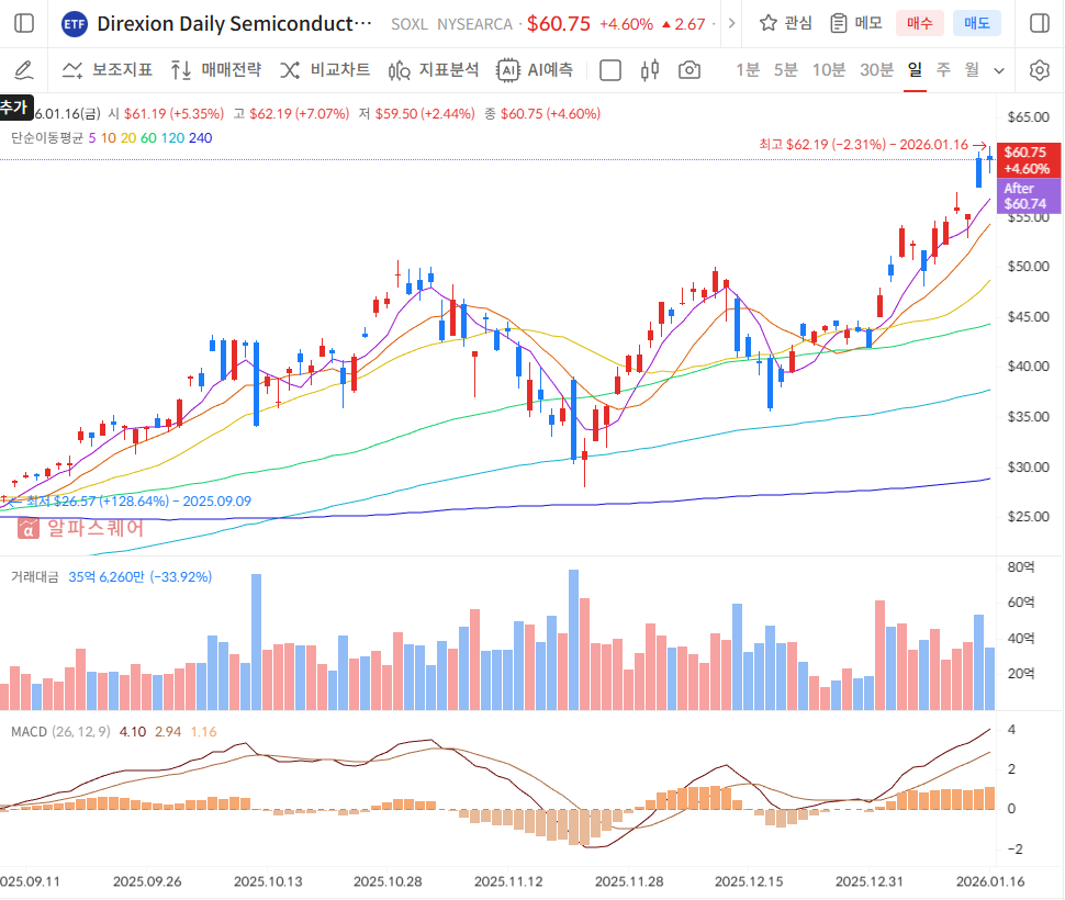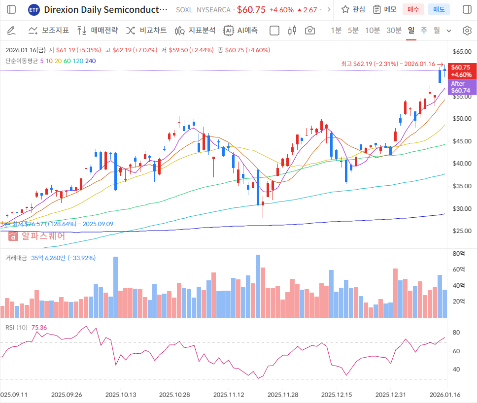 SOXL전망을 기술적 분석 관점에서 보면, 현재는 '과열'과 '추세 지속' 사이의 팽팽한 줄다리기 구간입니다. 10년 넘게 차트를 보며 느낀 점은, 레버리지 상품일수록 감정을 배제하고 숫자에 근거해야 한다는 것입니다.