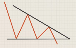 하락형 삼각형은 상승형의 반대 구조다. 저점은 일정하게 유지되지만 고점이 점점 낮아지면서 매도세가 점차 우위를 점하고 있다는 신호가 된다. 이 패턴에서 하방 지지가 깨지는 순간 매도 압력이 한꺼번에 터져 나오며 하락이 가속화되는 경우가 많다. 특히 약세장에서 자주 나타나는 패턴으로, 투자자들이 가격 회복에 대해 점점 기대를 하지 않고 있다는 심리적 상태를 보여준다. 기술적 분석 관점에서는 명확한 약세 패턴으로 인식된다.