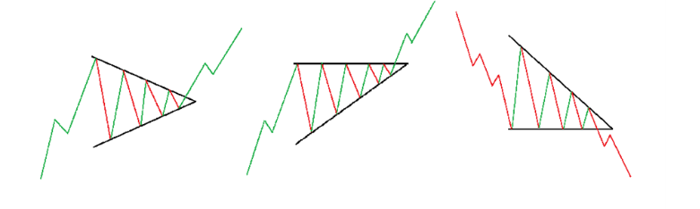 삼각형 차트 패턴은 크게 세 가지로 나뉜다: 1)상승형 2)하락형 3)대칭형이다.