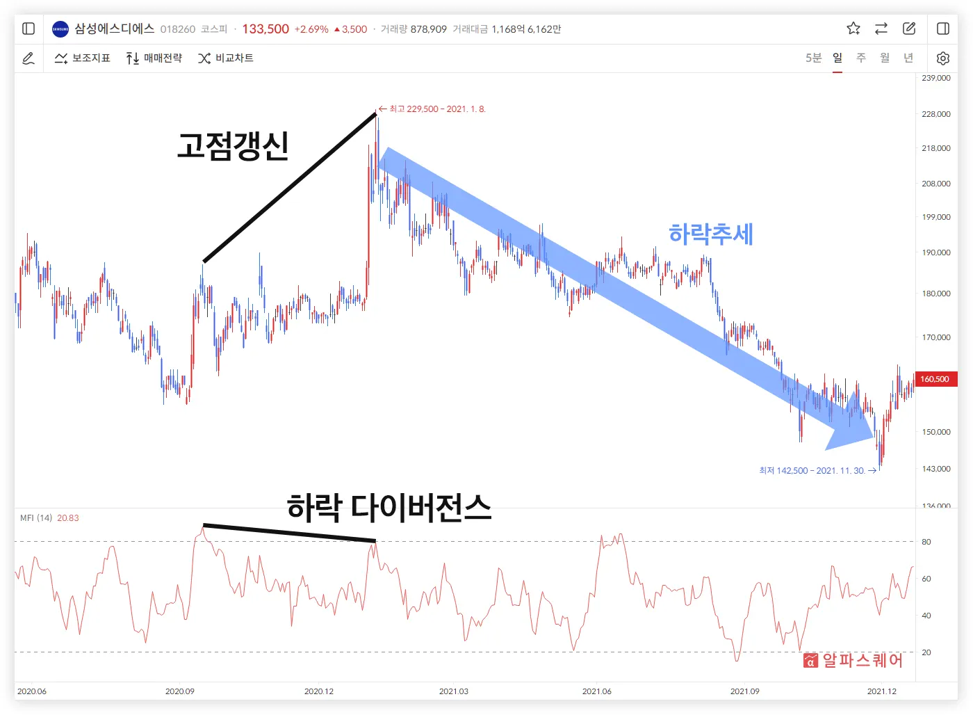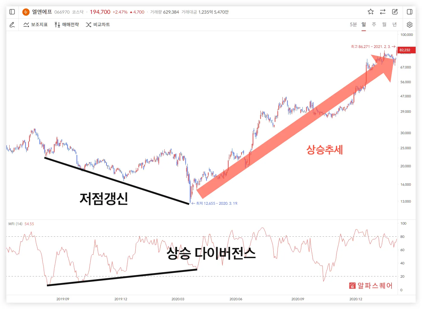 MFI를 활용하는 주요한 방법 중 하나는 다이버전스를 이용하는 것이다. 다이버전스란 주가의 방향과 지표의 방향이 반대로 움직이는 현상으로, 추세의 반전을 암시한다.