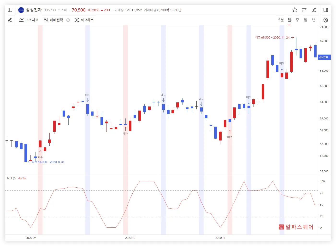 💡 MFI가 20선을 상향돌파하면 매수, 80선을 하향돌파하면 매도하는 전략을 사용할 수 있다
