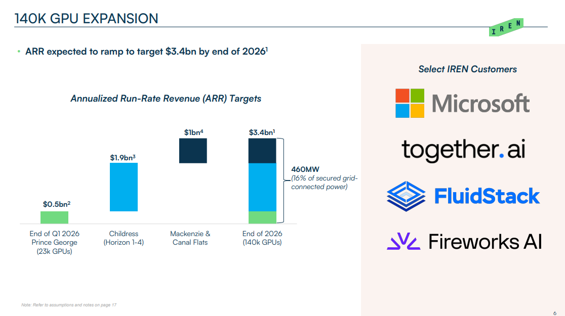 현재 기준으로 아이렌 시가총액은 약 131억달러 수준. 회사가 제시하는 그림은 향후 3개 분기 안에 ARR 34억 달러까지 끌어올리겠다는 플랜. MS 딜 + 캐나다·텍사스 데이터센터 풀가동 효과 포함.