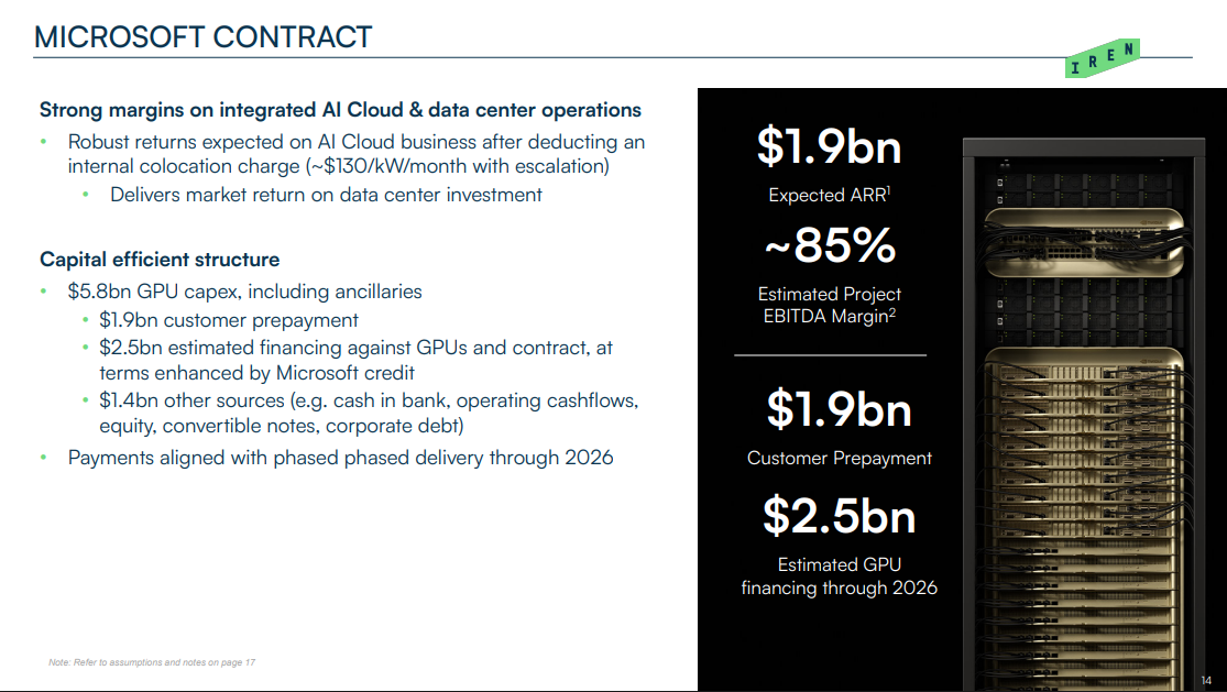 여기서 주목 해야 하는 포인트는 아이렌이 지금 당장 이 200MW GPU 인프라를 다 갖춘 상태가 아니라는 것. MS가 선 계약 + 선 자금 유입을 선택해서, 아이렌이 돈+추가 자금 조달을 바탕으로 GPU와 인프라를 깔도록 도와주는 구조임.