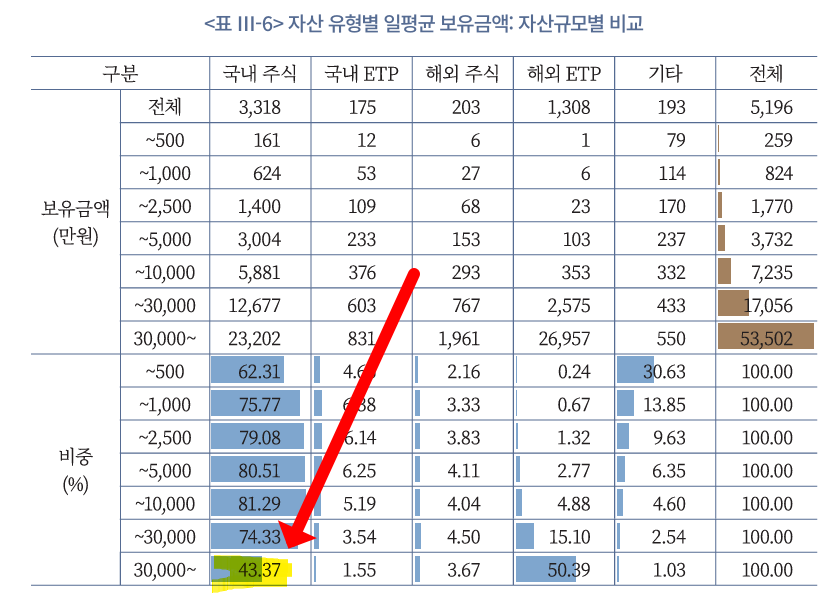 - [자산 유형별 일평균 보유금액]통계인데요. 독특하게 3억원 초과 고액투자자의 경우는 국내주식 비중이 급격히 낮아지고, 해외 ETP를 통한 자산배분이 급증합니다.