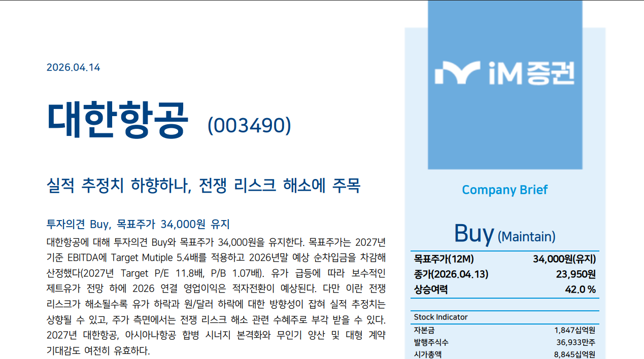 다음 분기에서 확인할 것은 명확하다. 첫째, 제트유가가 2분기 이후 얼마나 빠르게 안정되는지다. 둘째, 국제선 여객 운임과 화물 운임이 유류비 상승분을 어느 정도 전가하는지다. 셋째, 아시아나 적자 축소 속도가 계획대로 나오는지다. 이벤트 측면에서는 전쟁 리스크 해소와 합병 시너지 가시화가 중요하다. 이 두 변수가 동시에 개선되면 대한항공 주가는 “유가 급등 피해주”에서 “전쟁 리스크 해소 수혜주”로 프레임이 바뀔 수 있다.