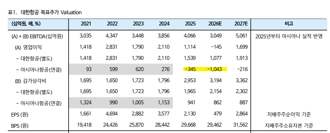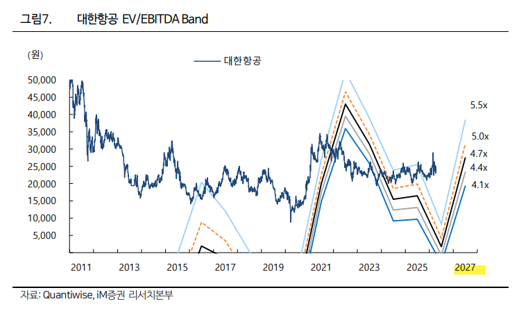 세 번째 축은 믹스다. 대한항공 단독이 아니라 대한항공, 아시아나, 진에어를 포함한 연결 구조를 어떻게 정상화하느냐가 중요하다. 현재 2026년 아시아나 연결 영업이익은 -1조 430억원으로 큰 폭 적자가 예상되지만, 2027년에는 -2,160억원으로 적자폭이 줄어든다. 이 적자 축소만으로도 연결 이익 체력에는 큰 변화가 생긴다. 네 번째 축은 합병 시너지와 비항공 모멘텀이다. 보고서는 2027년부터 대한항공-아시아나 합병 시너지가 본격화될 수 있고, 무인기 양산 및 대형 계약 기대감도 유효하다고 본다. 단기 실적표만 보면 놓치기 쉬운 부분이지만, 멀티플 재평가의 근거는 결국 이런 비선형 요소에서 나온다.