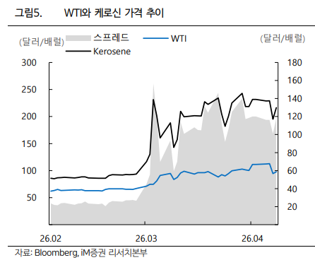보고서는 2Q26 별도 기준 매출액 4.9조원, 영업이익 -1,586억원을 전망한다. 수요가 무너져서가 아니다. 핵심은 제트유 가격이다. 4월 9일 기준 제트유 가격이 배럴당 216달러까지 상승했고, 보고서는 2분기 평균 제트유가를 175달러로 가정했다. 1분기 평균 124달러 대비 40% 이상 높은 수준이다. 이 경우 유류비 증가분이 전분기 대비 1조원 가까이 늘어날 수 있다고 본다.