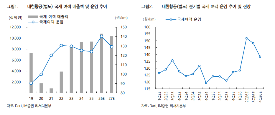 첫 번째 축은 국제선 여객 회복이다. 보고서에서 2026년 국제선 운임은 원/km 기준 142원으로, 2025년 124원 대비 크게 높아진다. 2027년에는 135원으로 일부 조정되더라도 물동량과 네트워크 효율이 유지되면 절대 이익은 살아남을 수 있다. 두 번째 축은 화물이다. AI 관련 고부가가치 화물과 재고 축적 수요는 단순 경기민감 화물보다 운임 방어력이 높다. 화물 Yield가 2026년 576원으로 높아지는 가정이 들어간 것도 같은 맥락이다.