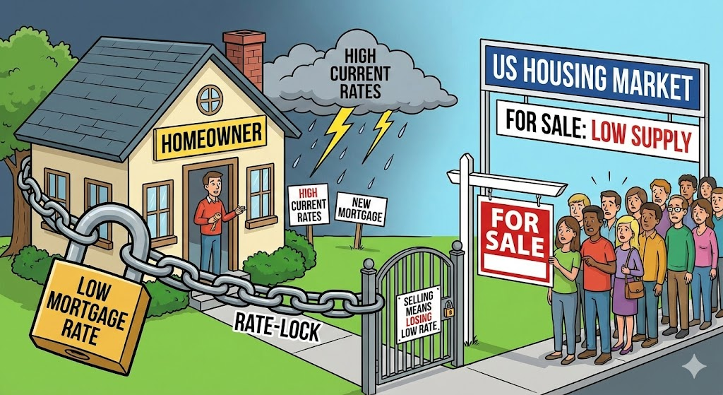문제는 지금부터입니다. 기준금리가 급등하면서 현재 시장의 모기지 금리는 6~7%대를 호가하고 있습니다. 3%짜리 대출을 쓰고 있는 집주인 입장에서 지금 살던 집을 팔고 새집을 사려면, 이자를 두 배 이상 더 내야 합니다. 굳이 손해를 보며 집을 팔 이유가 사라진 것이죠. 이것이 바로 매물이 시장에 나오지 않게 묶어버리는 '금리 잠김 효과'입니다.